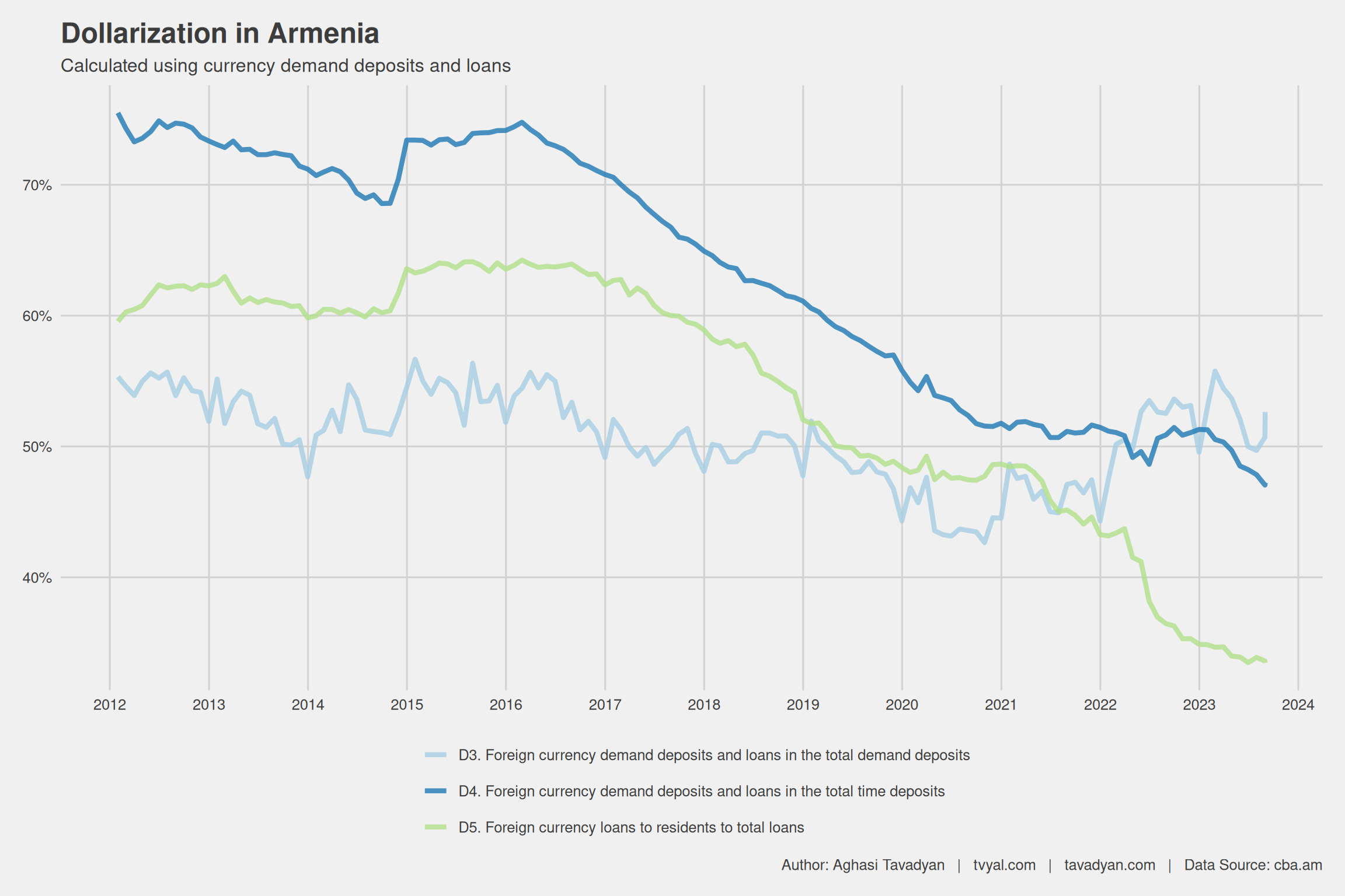 The second chart presents the dollarization level according to demand deposits and foreign currency loans. What is interesting here is that the volume of foreign currency in deposits (D4) and the volume of foreign currency in loans (D5) had almost the same dynamics and moved in the same direction until March 2022. From April 2022, these indicators showed opposing trends. Foreign currency deposits sharply decreased, while the percentage of foreign currency loans increased. This was due to a rather significant inflow of foreign currency into Armenia in 2022 (for more, see Tvyal Newsletter: Analysis of International Money Transfers). The large inflow of foreign currency in 2022 strengthened the dram, which resulted in an increase in the percentage of loans taken in dram and deposits placed in foreign currency, as the amount of dollars in the system was large, and many preferred to deposit it.