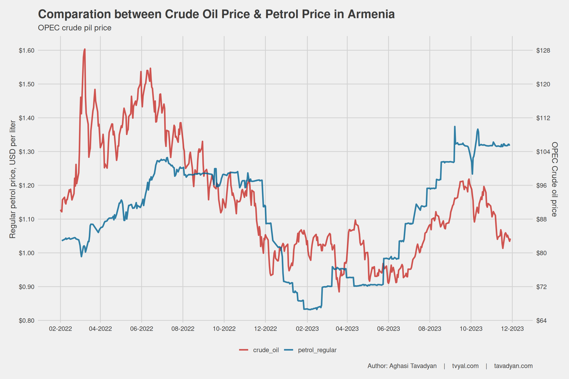 I should note that it is not accurate to directly compare gasoline prices in Armenia and the USA, as the USA is the largest oil-producing and consuming country, which already imports almost no oil from OPEC+ countries. Armenia does not have oil reserves and imports gasoline from Russia. However, global oil prices affect gasoline prices in both the US and Armenian markets, as shown in the chart. Gasoline prices exhibit the same upward and downward trends in almost all countries.