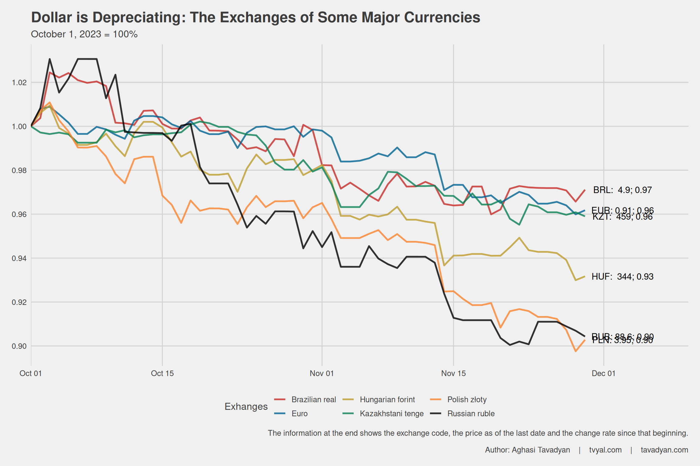 Chart 3. Dollar Depreciation. Dynamics of several exchange rates in the region (01-11-2023 = 100%)