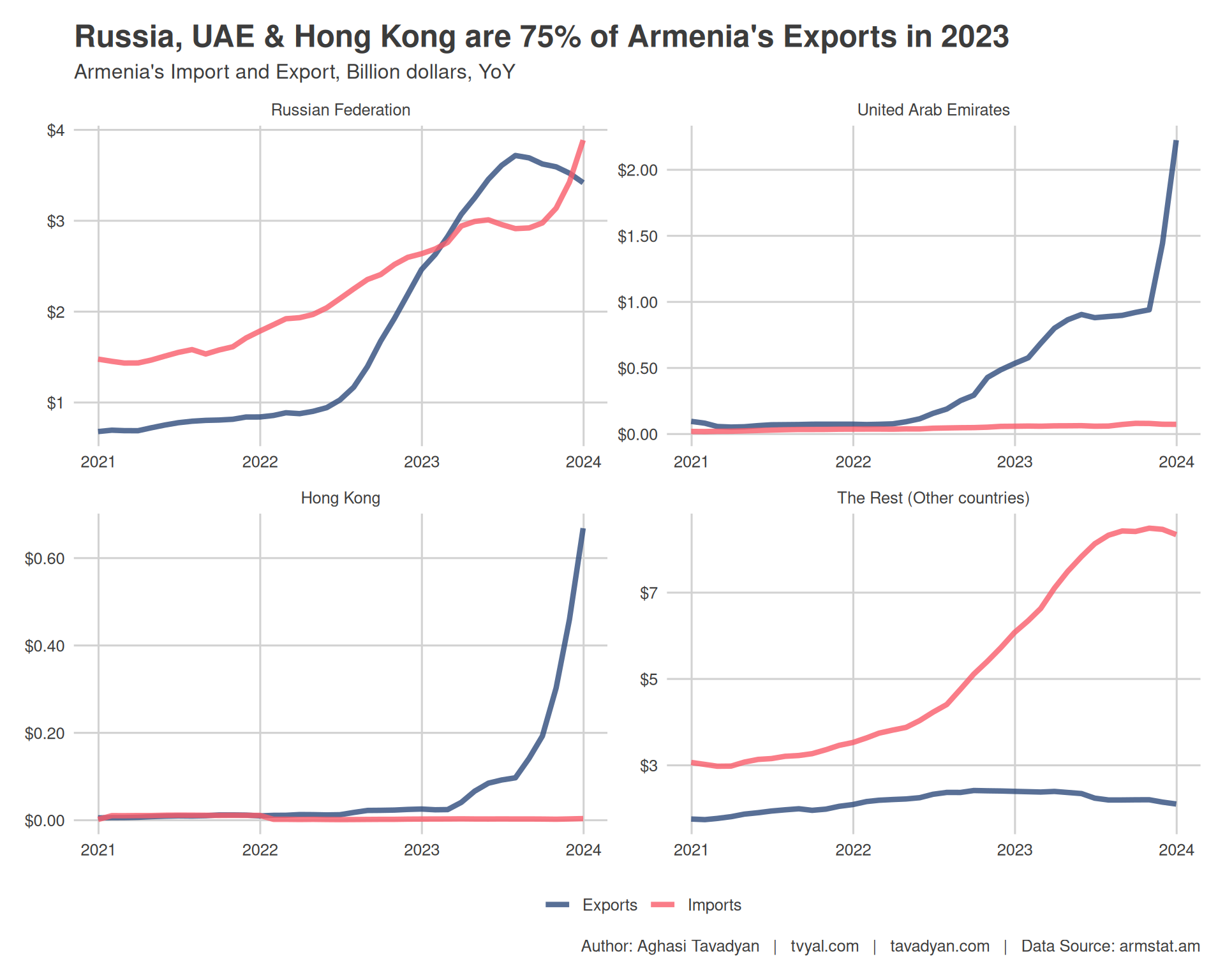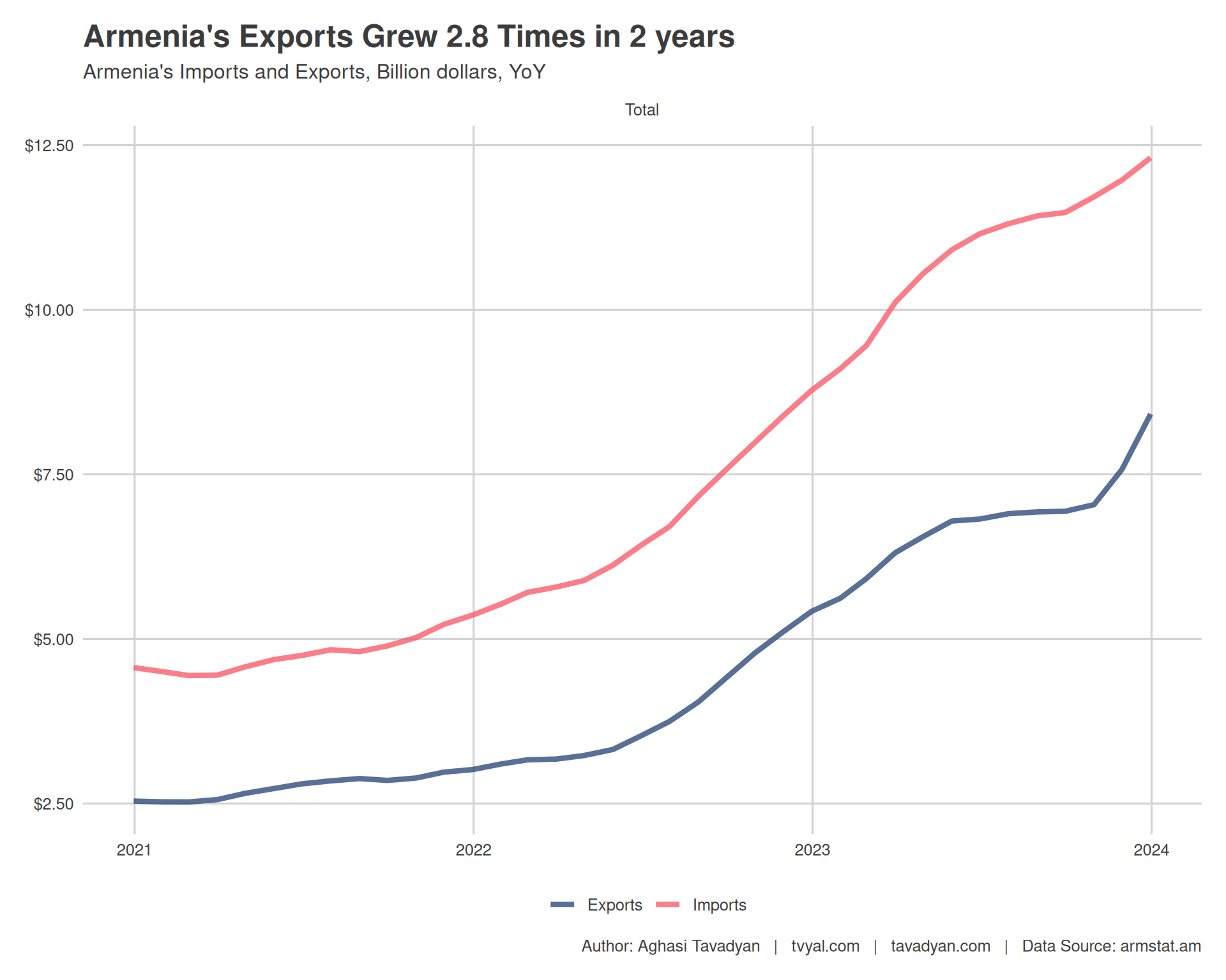 It is noteworthy that a significant portion of the export growth in 2023, 31 percent or $2.6 billion, occurred in the last two months, specifically November and December. This growth is reflected in the chart, where the export curve, which had not shown a strong upward trend from May to September, sharply breaks upwards during this period. It is also remarkable that as of December 2023, Armenia reached a historic milestone: exports for that month exceeded imports for the first time. Without this sudden surge, our forecast in September 2023 was that exports for 2023 would be around $7.1 billion.