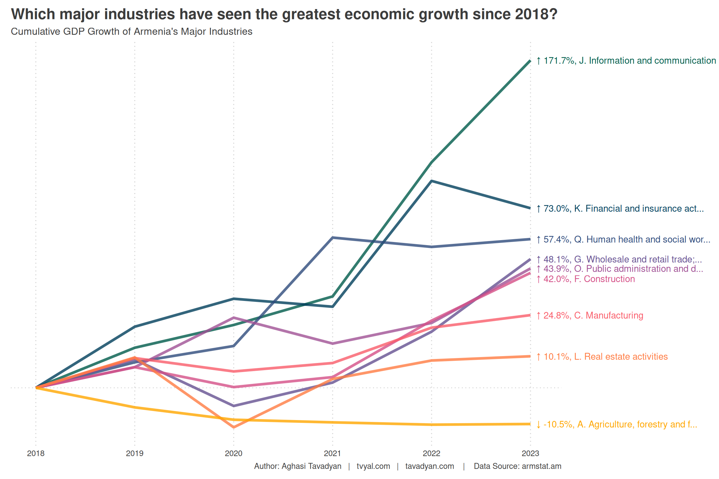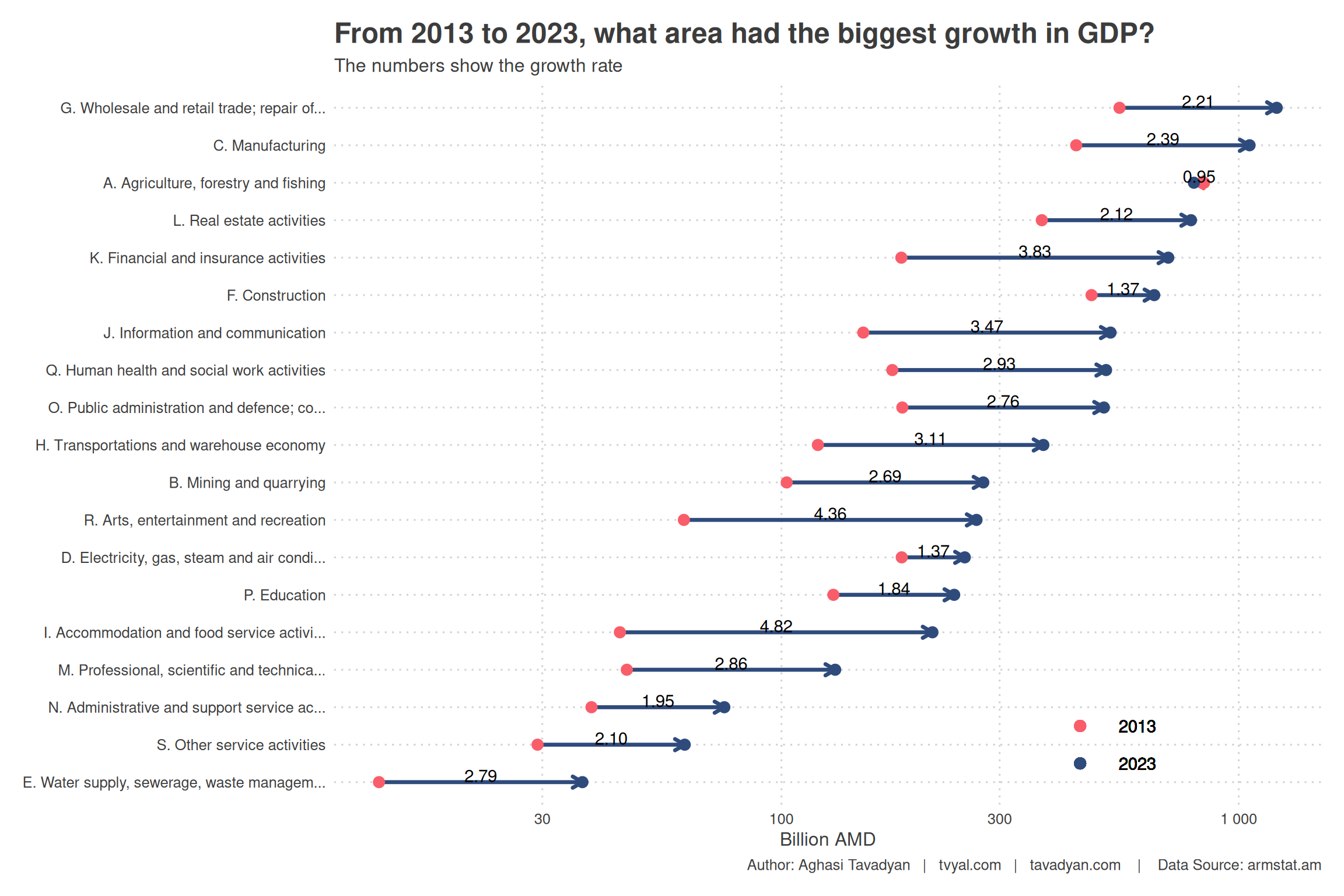 The largest growth was registered by the (I) Accommodation and food service activities and (R) Arts, entertainment and recreation sectors, which have grown by more than 4.8 and 4.3 times respectively over these 10 years. This primarily speaks to the development of tourism in Armenia.