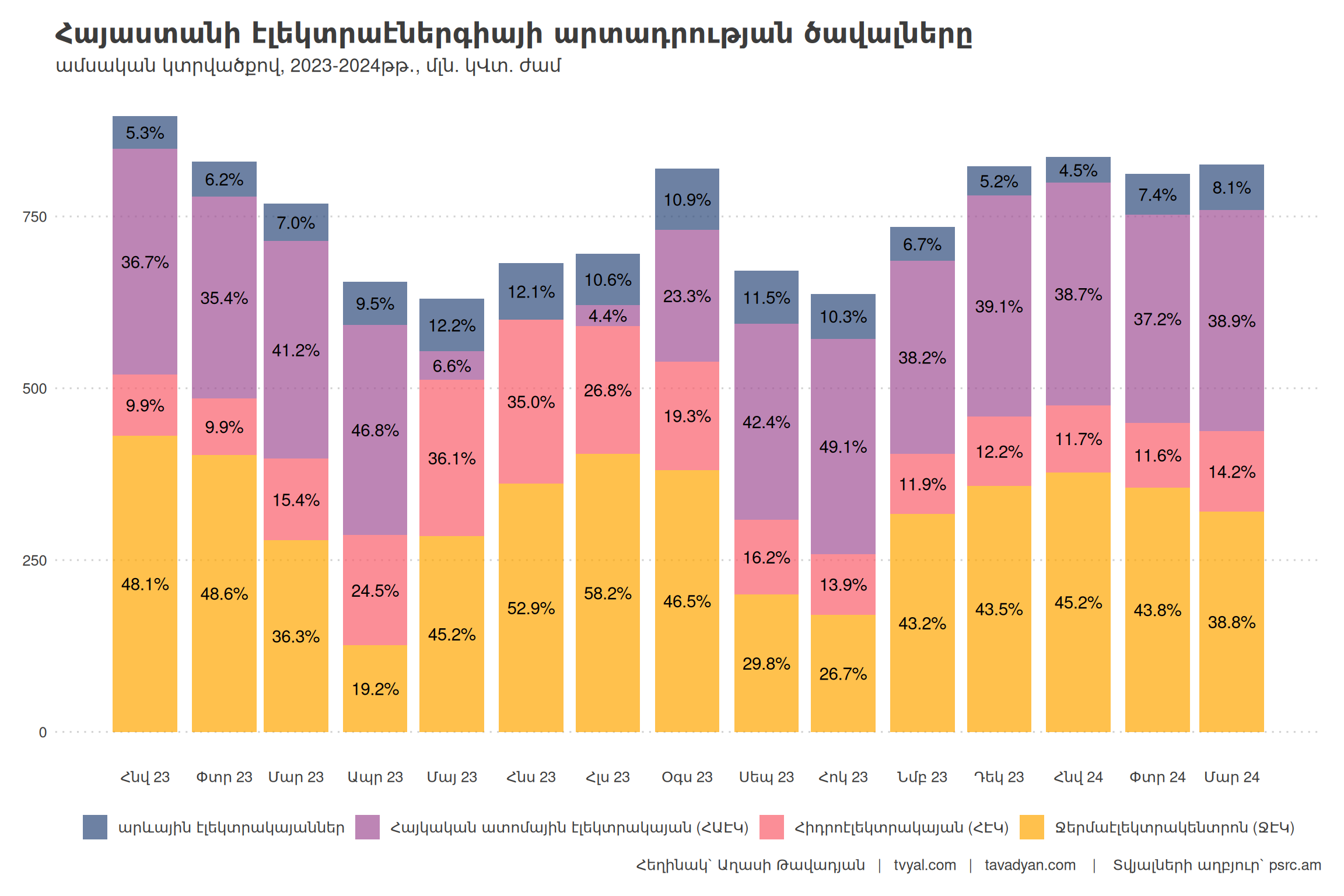 The first chart depicts monthly electricity production in Armenia by types of plants for 2023 and the first quarter of 2024. The chart shows the seasonality of the different sources of electricity production.