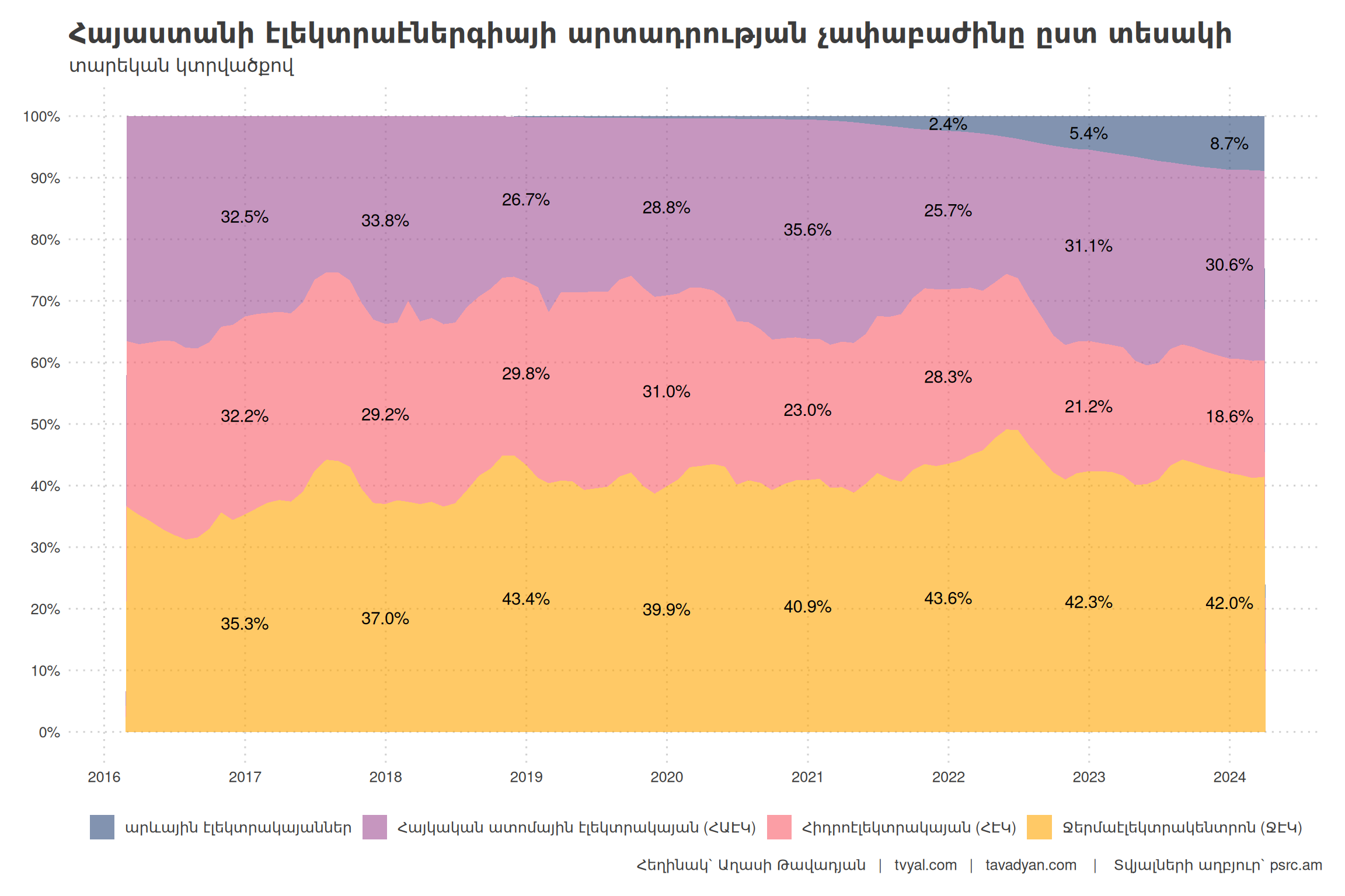 The third chart reflects annual electricity production by types of power plants. At the bottom of the chart the percentage weights of each year’s production are given. Thus in 2015, 35 percent of electricity production was provided by TPPs, 32 by ANPP, and 28 by HPPs. In 2023 it is respectively 41, 31, 19, and solar power plants already at 8.7 percent.