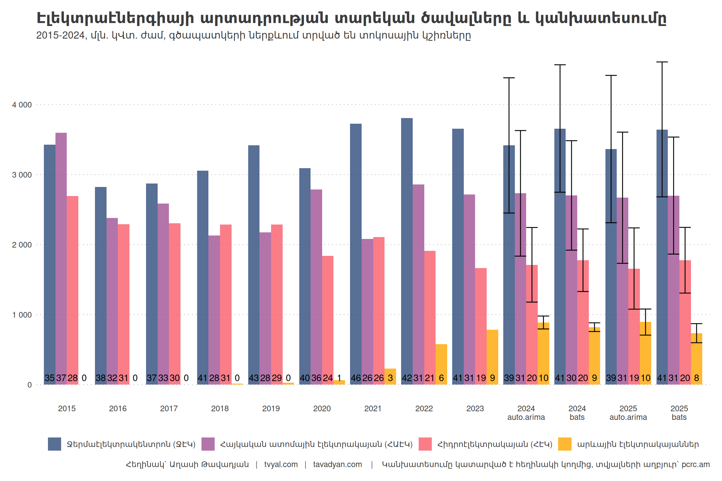 The 4th chart displays the monthly volumes of electricity produced in Armenia by types of power plants. The chart also provides a 2-year forecast up to 2026.