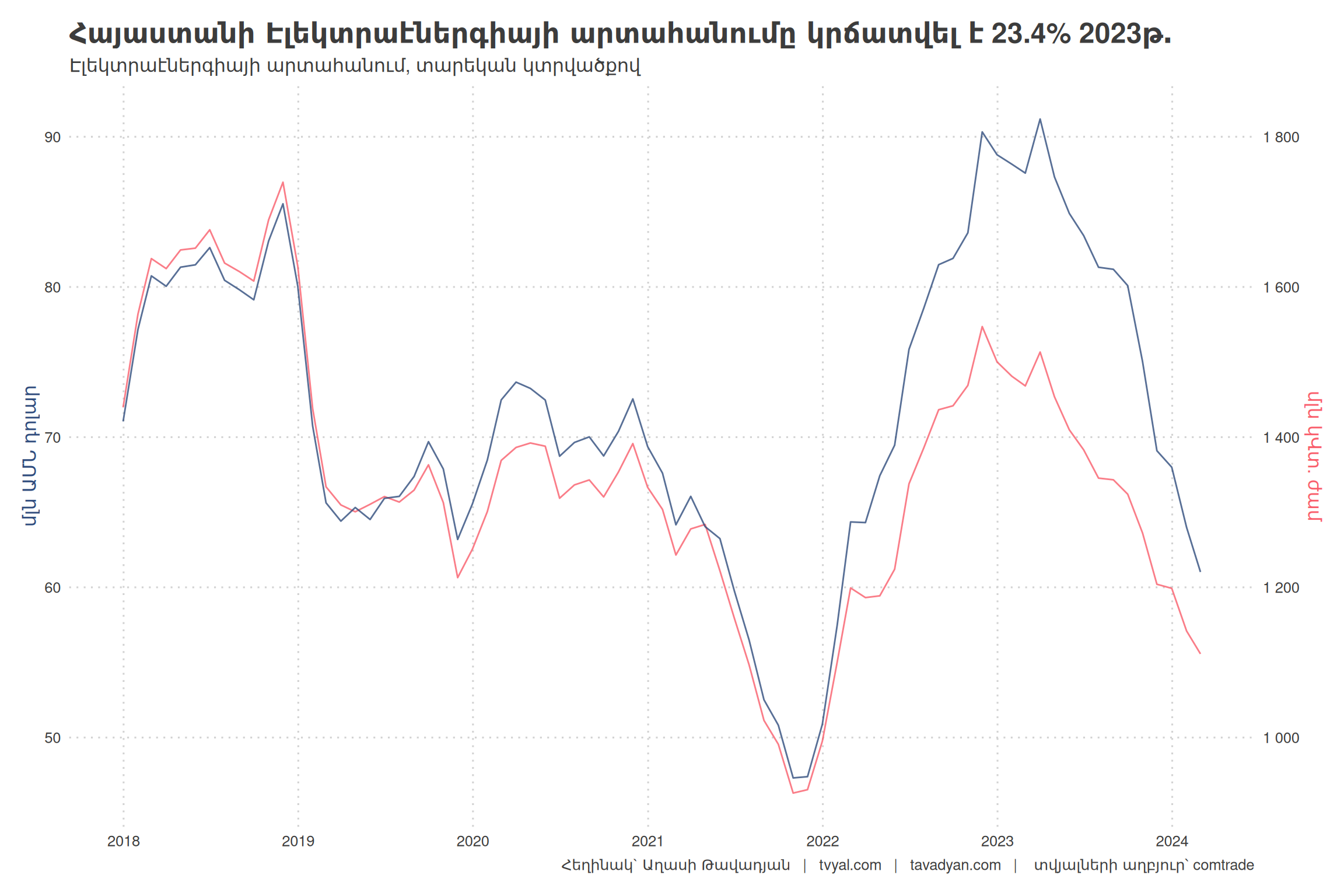 In 2023 there is a decline in electricity exports of 23.4% to 68.0 million dollars, and on an annual basis there is still a sharp decline in exports. Electricity is mainly exported to Iran in exchange for gas. Since electricity must be consumed during production, exports are organized during surplus hours.