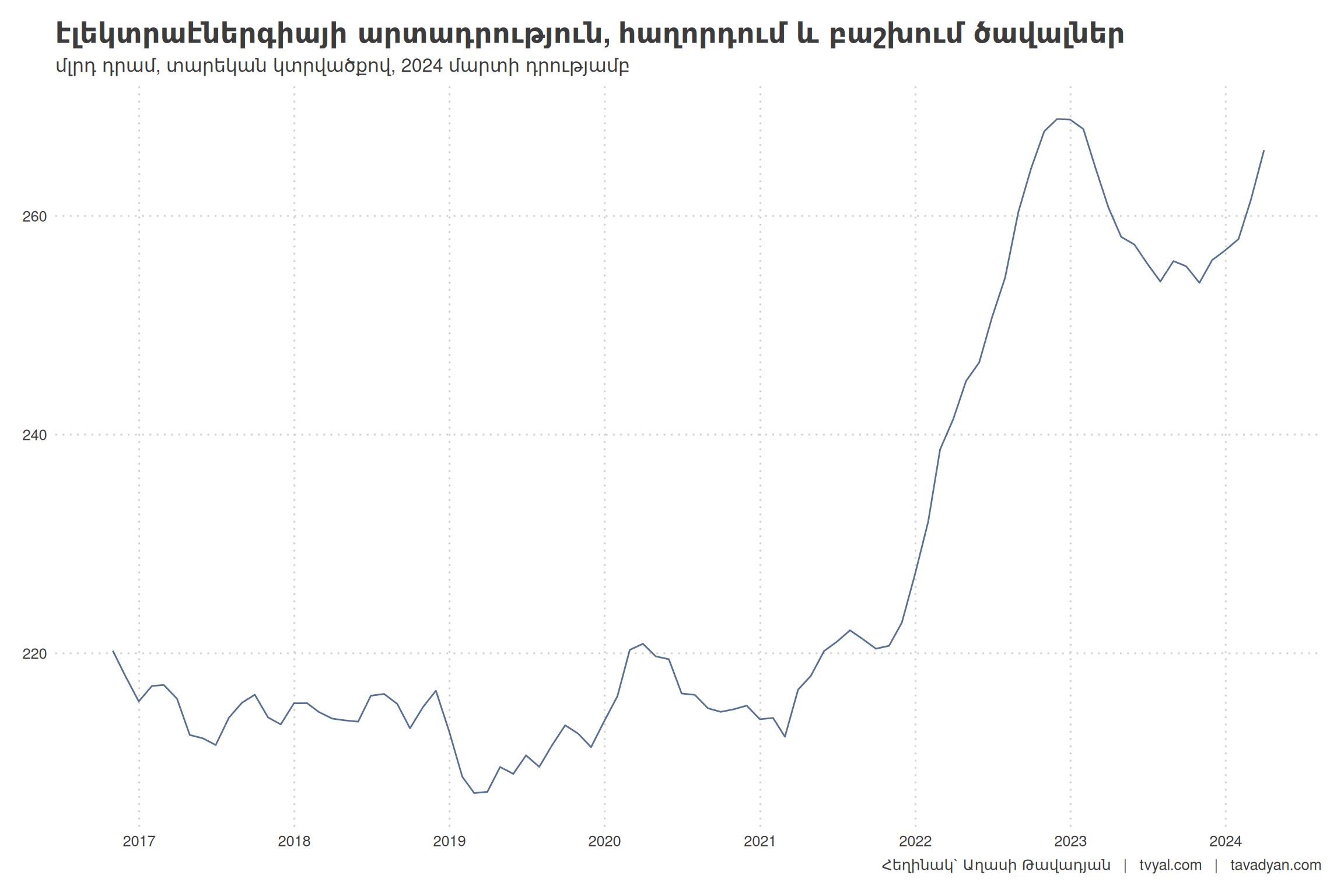 The final chart reflects electricity production within the volumes of industrial product output at current prices. The table is given on an annual basis. The rapid growth of electricity production in 2022 is also visible here. Total electricity production volume in drams grew by 18.3% in 2022 (from 227.2 billion drams up to 268.8 billion drams). In 2023 a 4.4% decline was already recorded, down to 256.9 billion drams; however, according to official statistics, within the volumes of industrial product output there is already a growth in electricity production.