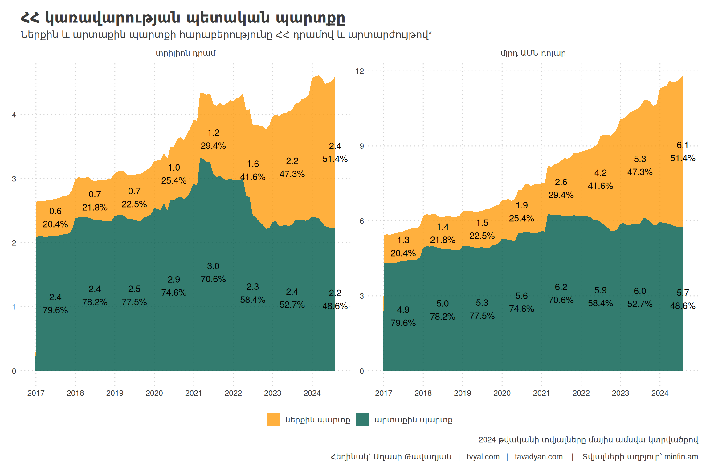 For the first time in the structure of the Republic of Armenia’s state debt, the share of domestic debt has exceeded 50 percent. As of May 2024, the government’s state debt amounted to 11 billion 577 million dollars or 4 trillion 496 billion drams, of which 50.2 percent accounts for domestic sources, and 49.8 percent for external sources.