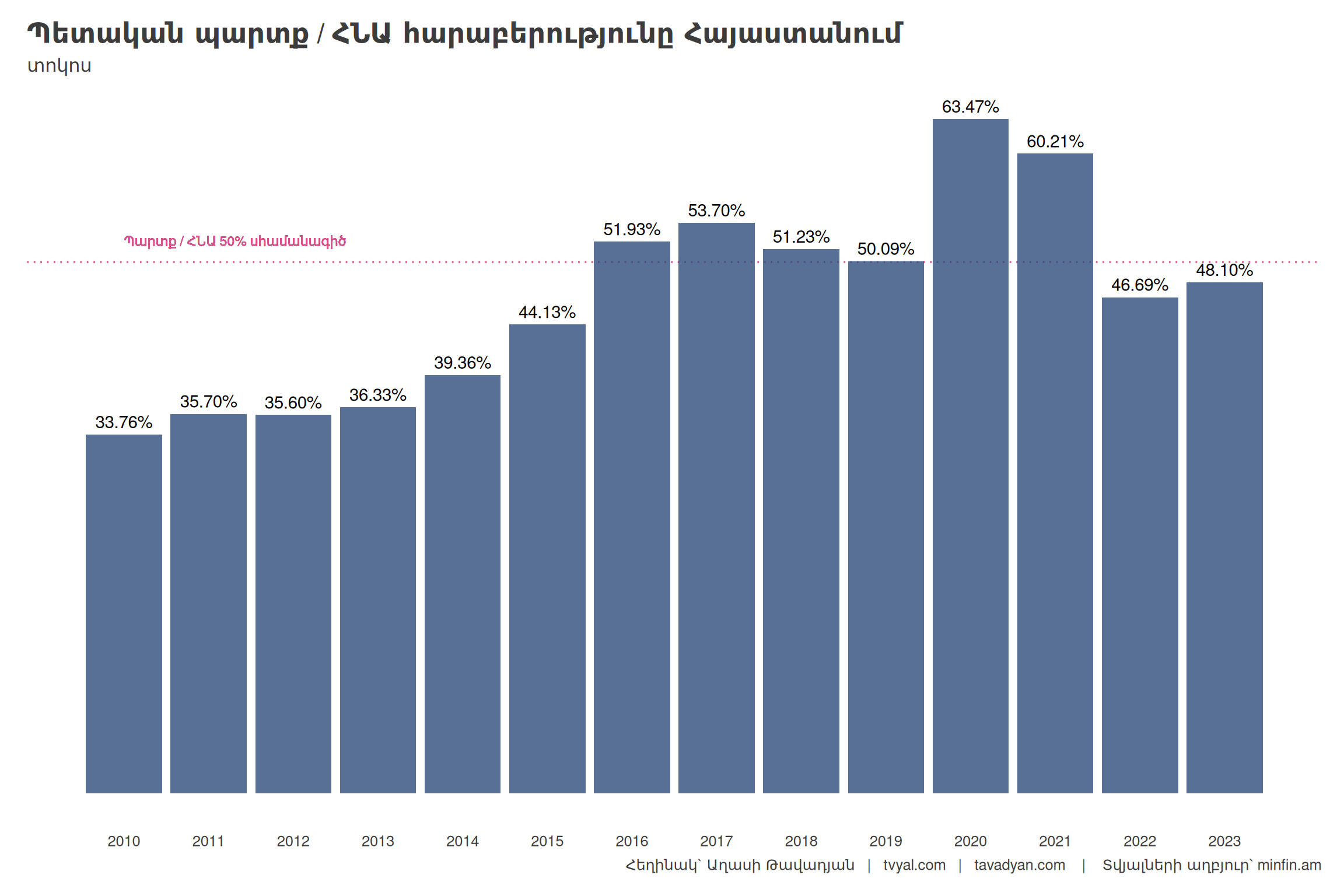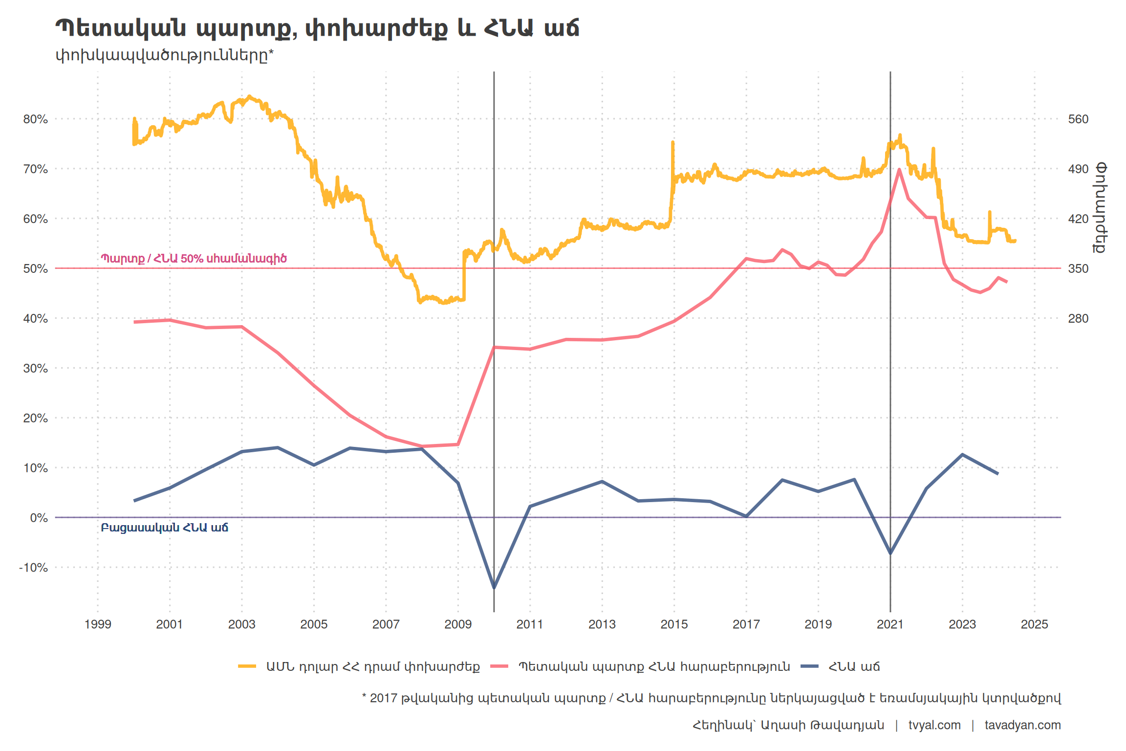 The last chart clearly shows the impact of the dollar exchange rate on state debt servicing and, consequently, on the state debt to GDP ratio. The more the dram appreciates against the dollar, the cheaper state debt servicing becomes, therefore the state debt to GDP ratio decreases. Conversely, the more the dram depreciates, the more the state debt to GDP ratio tends to grow. It is worth noting that the Armenian dram has been the most appreciated among convertible currencies since 2020, which negatively affects real exports, as well as tourism and the IT sector. This exerts some pressure on the dram, which is de facto softly pegged to the dollar. The depreciation of the dram will negatively affect state debt servicing and, as a secondary consequence, GDP growth. The chart also shows the inverse correlation between state debt and GDP growth. In the case of negative GDP growth, state debt grows sharply because the target set by the state budget is not met. As a result, the budget reserve fund is forcedly consumed, and subsequently, the state debt also grows. This trend can be seen in the last chart in 2010, following an average economic growth of 12 percent between 2002 and 2008. This decline was due to the Global Financial Crisis. A similar situation was also observed in 2020: the economic downturn this time was due to another global phenomenon, the COVID-19 pandemic. As a result, both crises increased the state debt to GDP ratio. In other words, the dram exchange rate has a direct impact on state debt growth, while GDP growth has an inverse impact. Over the last 25 years, negative GDP growth has mainly been due to global “black swan” events.