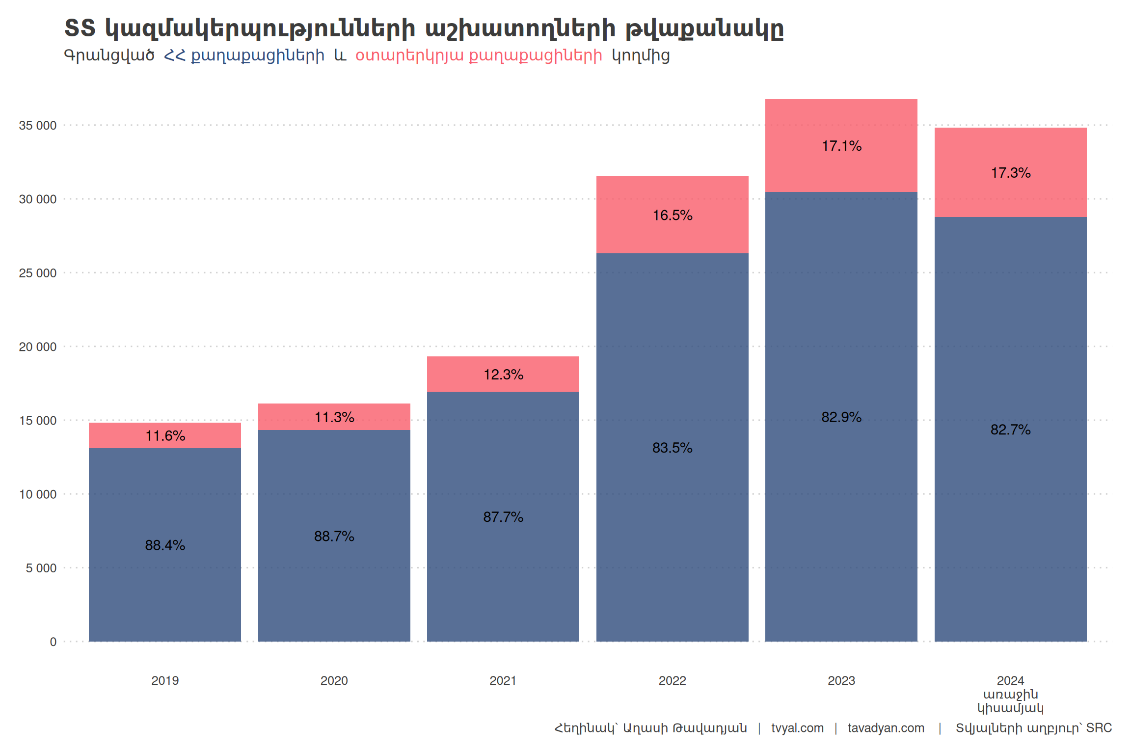Interestingly, according to data provided by the State Revenue Committee (SRC) of the Republic of Armenia, companies registered in Armenia have an average of 24.5 employees, while foreign-registered companies have an average of only 0.74 employees. This significant difference may indicate the presence of numerous “mailbox companies.” In all likelihood, during the first half of 2024, “mailbox companies” registered by RA citizens were closed and subsequently reopened by foreign citizens. Mailbox organizations exist mostly on paper for tax or legal purposes but have almost no real operations.
