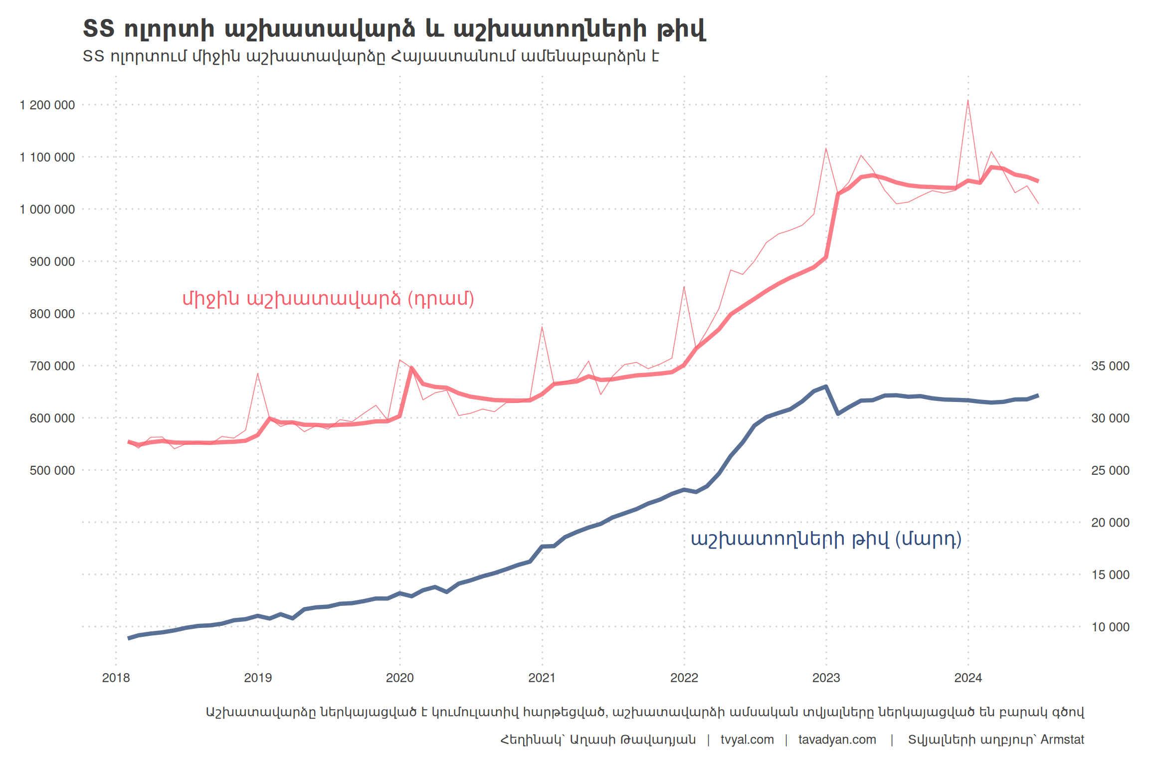 The peak of salary and employee growth occurred at the beginning of 2023. It is worth noting that the sharp growth started at the beginning of 2022, which coincides with the influx of relocated individuals from Russia. However, a slowdown in growth rates has been observed over the past year.