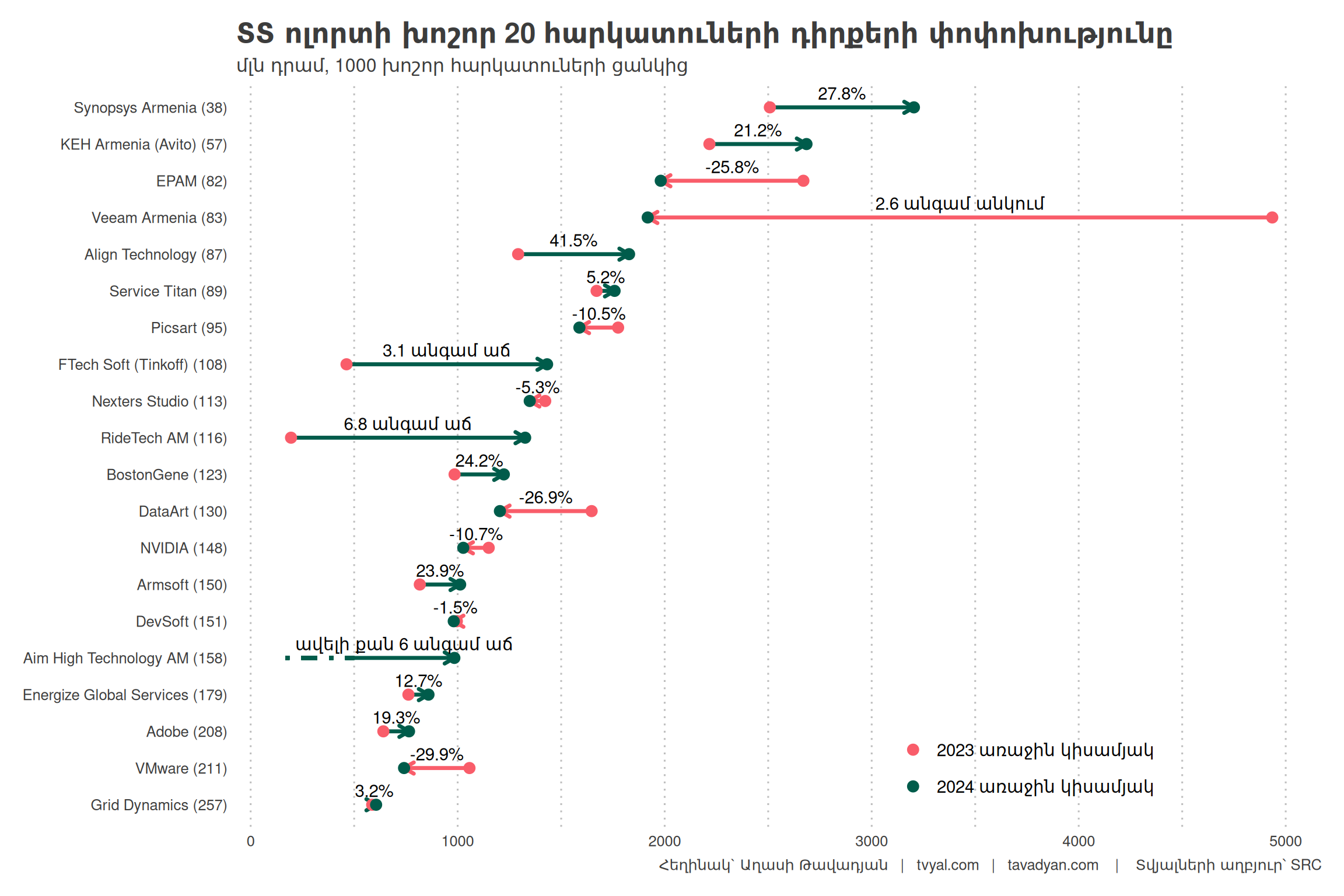 Synopsys Armenia is the leader, providing 12% of the paid profit tax (1.1 billion drams). However, taxes paid by eight of the 20 largest taxpayers in the IT sector have decreased. A particularly significant drop was recorded in the cases of Veeam Armenia, VMware, DataArt, and EPAM, mainly due to a decrease in income tax.