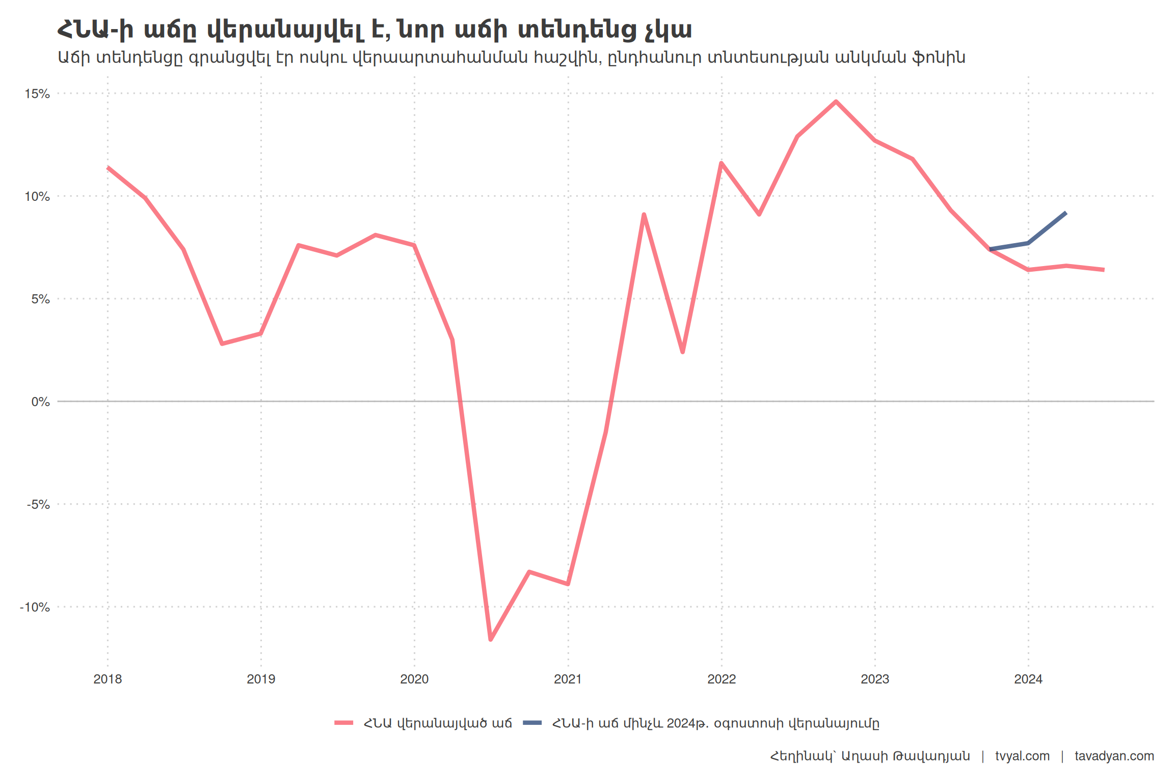 - Long-term average growth: Armenia’s long-term average economic growth rate is about 4.5%. Any system tends to return to its long-term average unless there are qualitative changes within that system capable of generating sustained, long-term value-added growth.