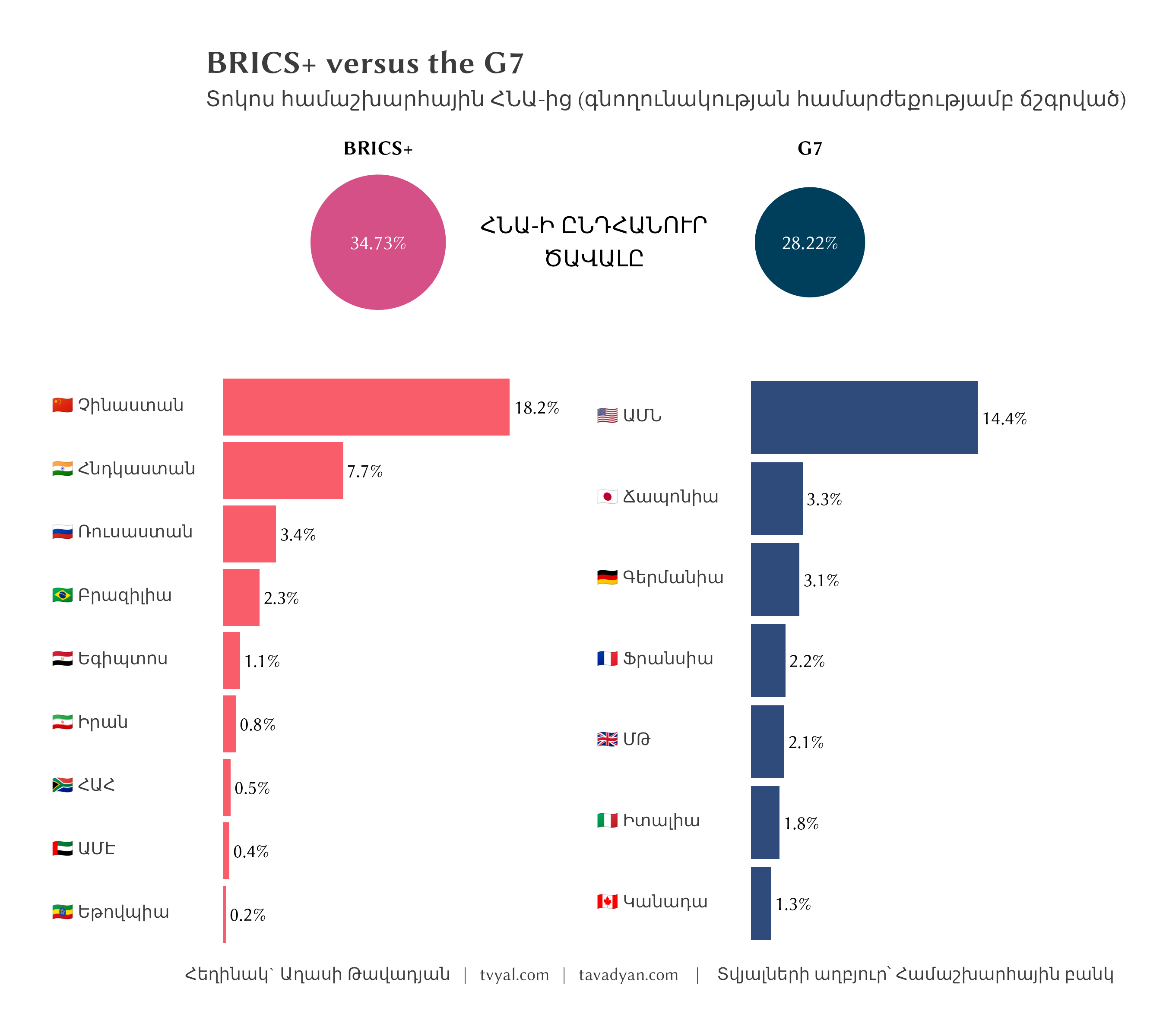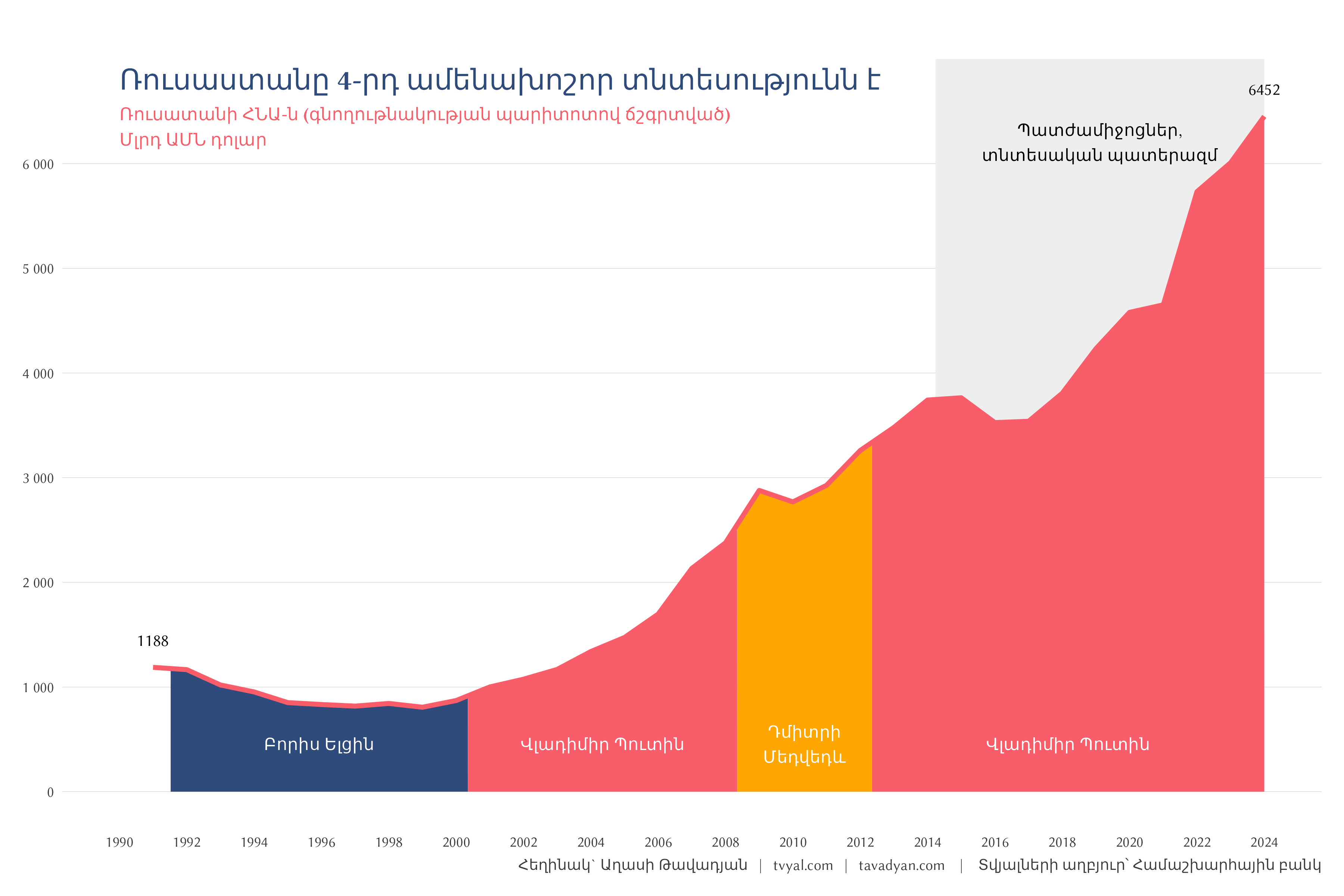 Purchasing Power Parity (PPP) is an economic indicator used when comparing the economies of different countries. It takes into account price differences between countries, measuring how much the same basket of goods and services costs in different countries. For example, if the same consumer basket costs $100 in the US and 25,000 AMD in Armenia, then the PPP exchange rate will be $1 = 250 AMD. This allows for a more accurate comparison of the true economic potential of countries, with which economies can acquire equivalent goods, services, and also pay wages.
