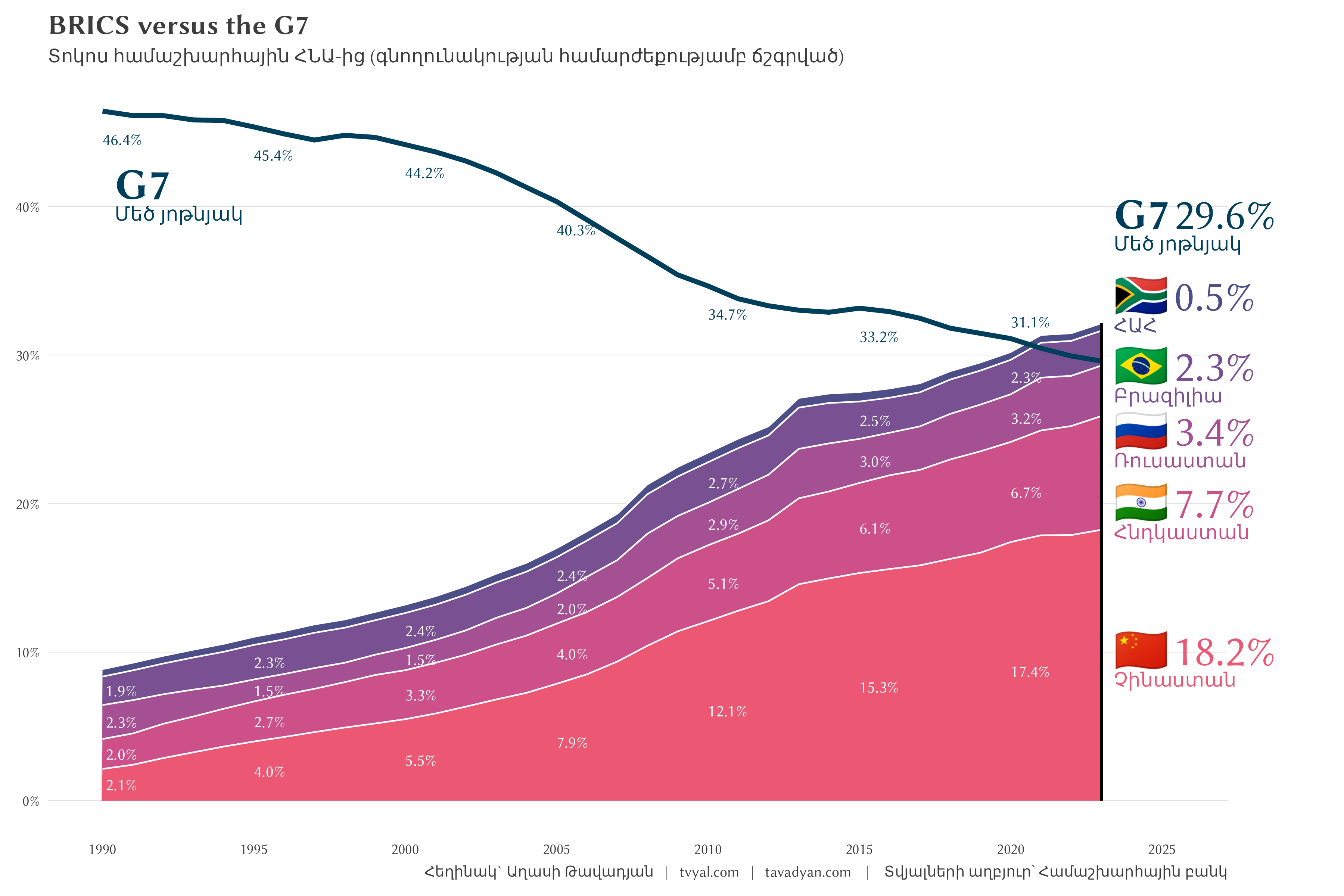 The creation of alternative means of payment among BRICS+ members is also telling in the context of the steady decline of the Group of Seven’s (G7) share in global GDP, dropping from 46.4% in 1990 to 29.6% in 2025, while the BRICS countries have recorded steady growth. This is not just about relative economic weight; it is about creating parallel economic institutions and mechanisms. The summit presented a number of concrete economic initiatives:
