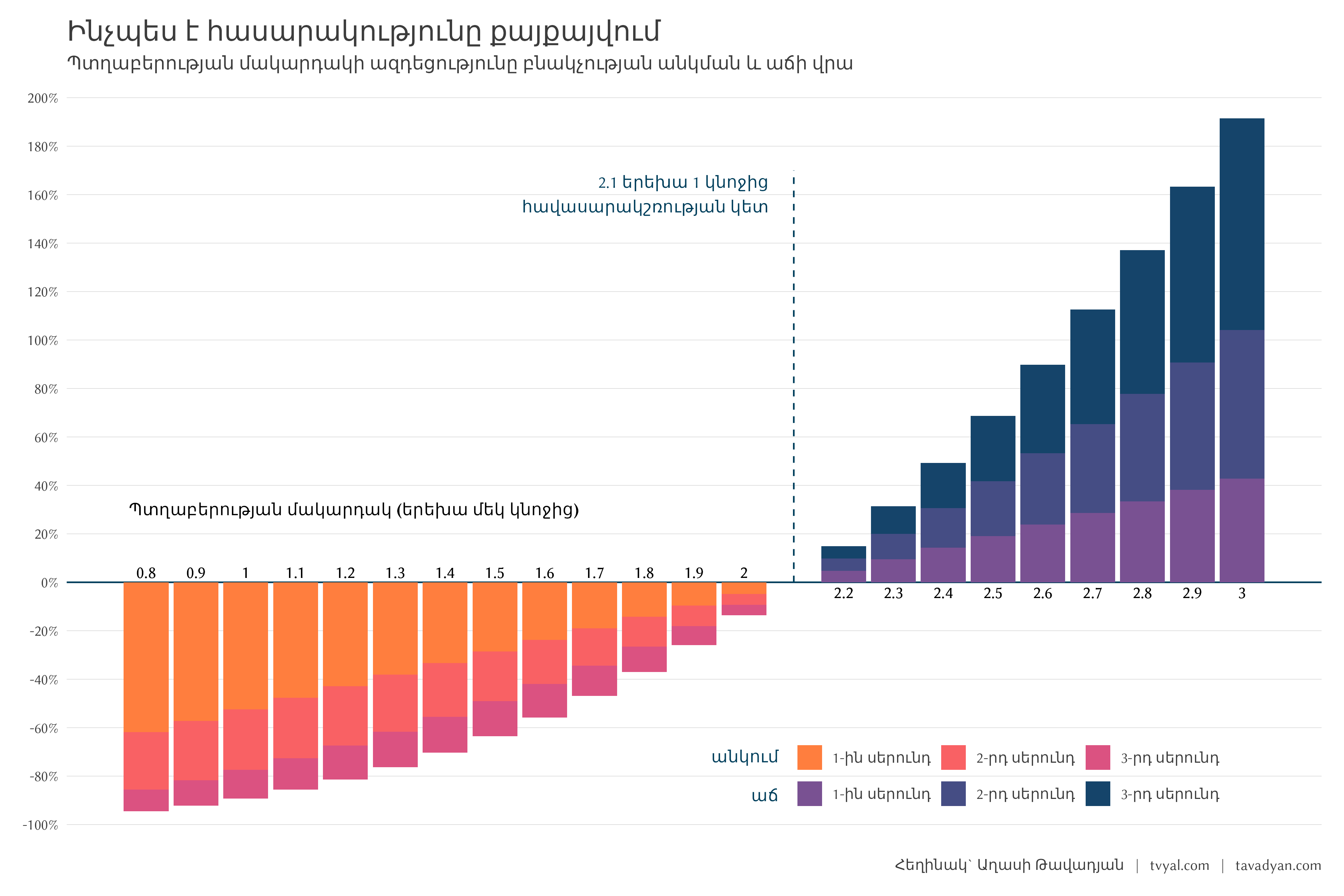 The third chart reveals the mathematical reality of population decline across generations. With Armenia’s current fertility rate of 1.6:
