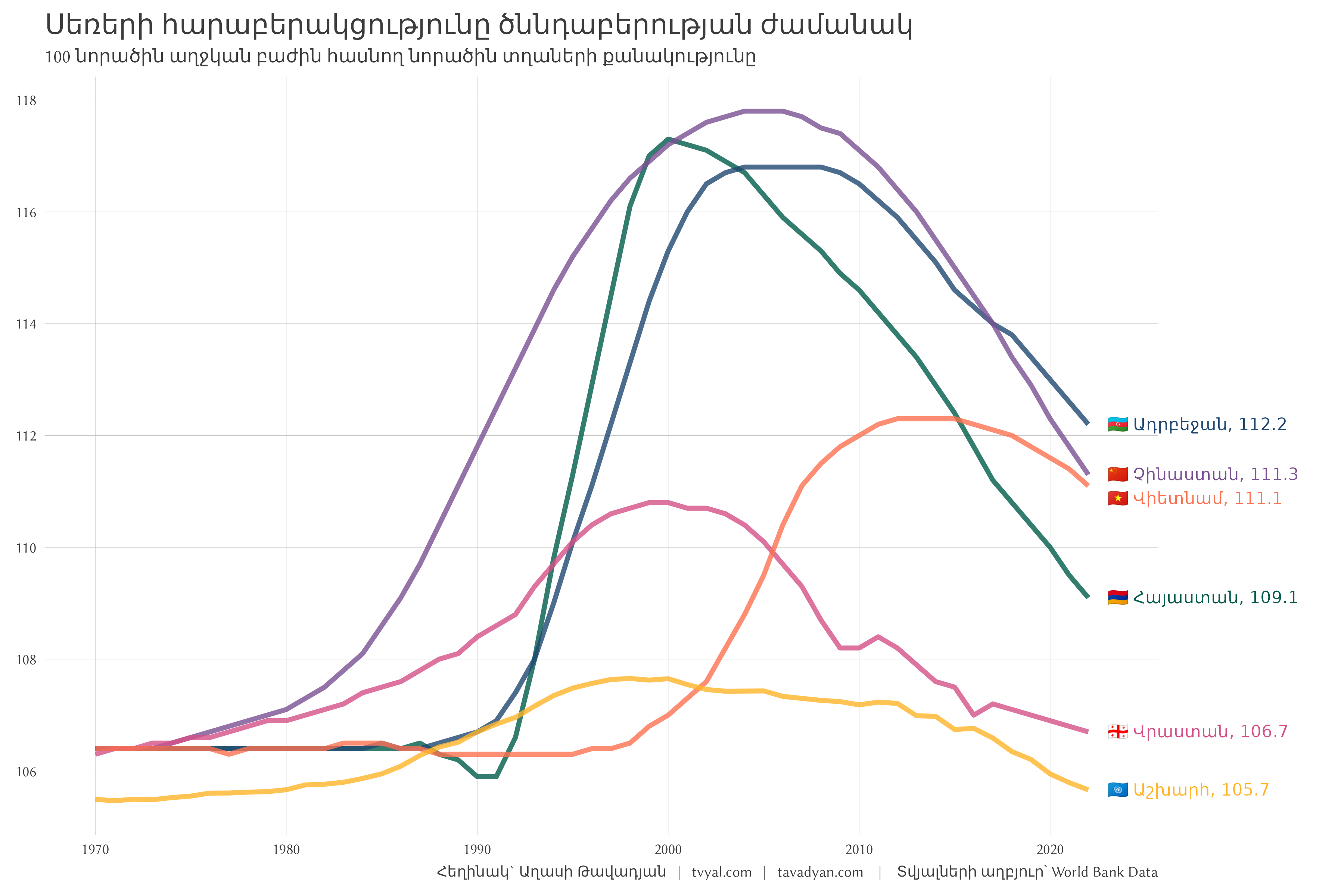 Note that until 1990, Armenia was at the normal level of 106 boys per 100 girls. After the first Artsakh war, this normal ratio was sharply disrupted in both Armenia and Azerbaijan, in favor of the birth of boys, which can be explained by the fact that a significant number of men died during the war, as a result of which women outnumbered men by about 10 percent.