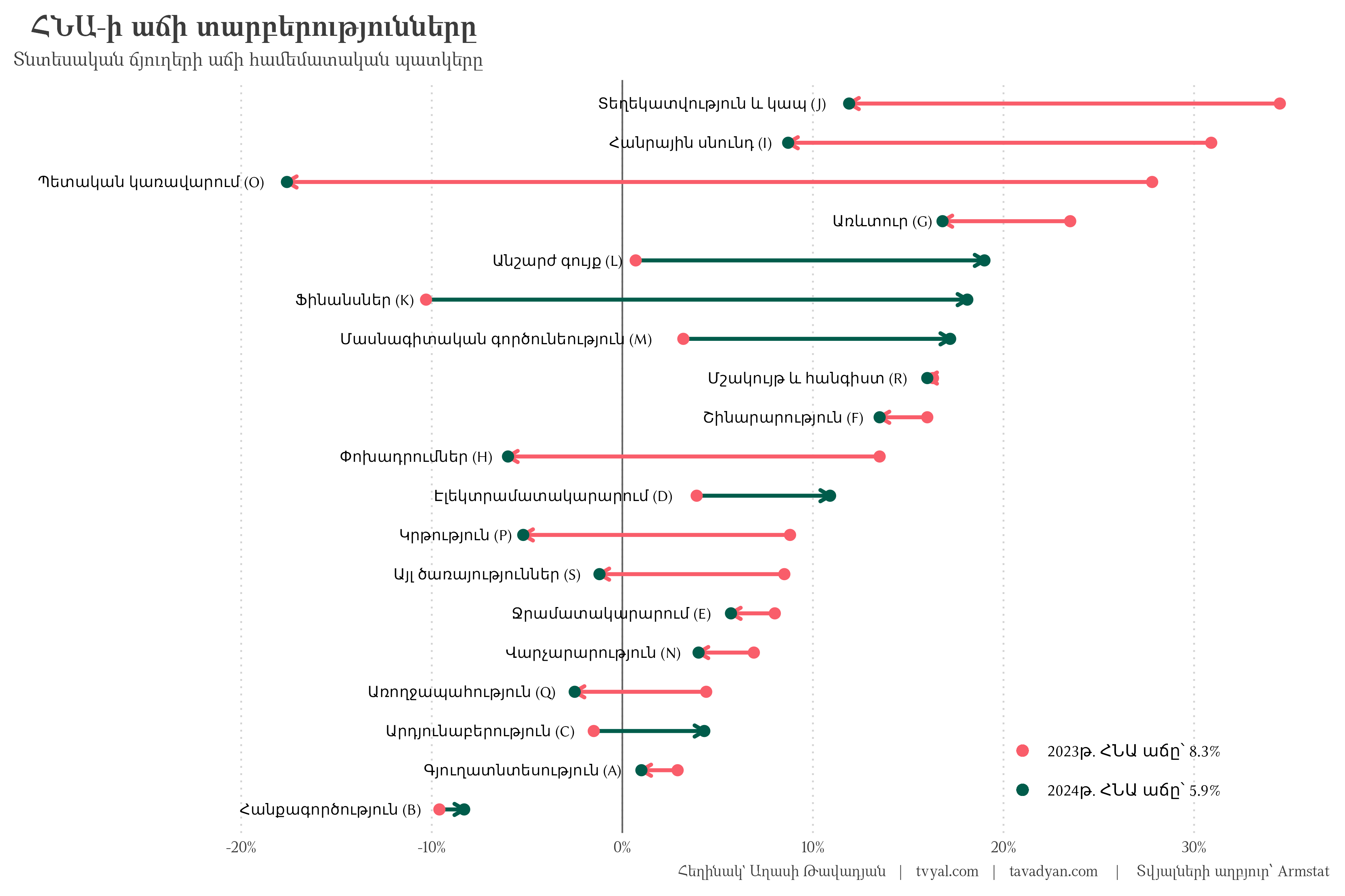 - Real estate transactions and the financial sector grew noticeably. Here, the significant contribution of real estate operations deserves special attention. It includes “Imputed rent for owner-occupied dwellings”, essentially evaluating the potential rent of all apartments in Armenia, regardless of whether they are owner-occupied or rented. This means that about one-third of the 5.9% growth is attributed to the increase in the market value of real estate, which cannot be considered a stable basis in the long term. And since there is currently a drop in apartment prices in the real estate market, it is possible that the growth of this sector will not have a long-term foundation and will not contribute to GDP growth at the same pace in 2025.