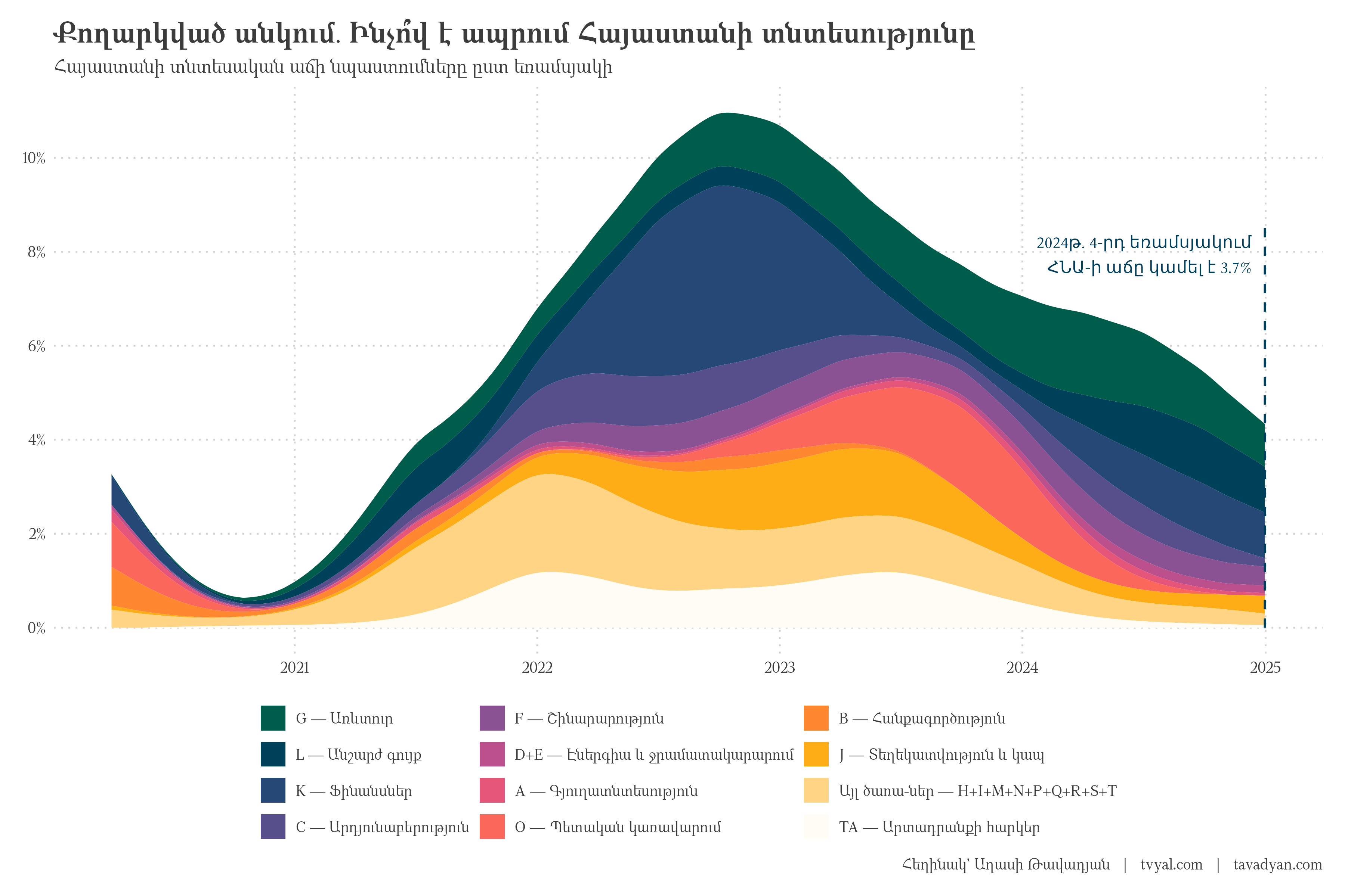 - Growth is mainly provided by trade, real estate, and financial services, which are highly dependent on external factors (more: ๐ ๐๐ Beyond the Border: Armenia’s Tourism Growth and Potential Decline).