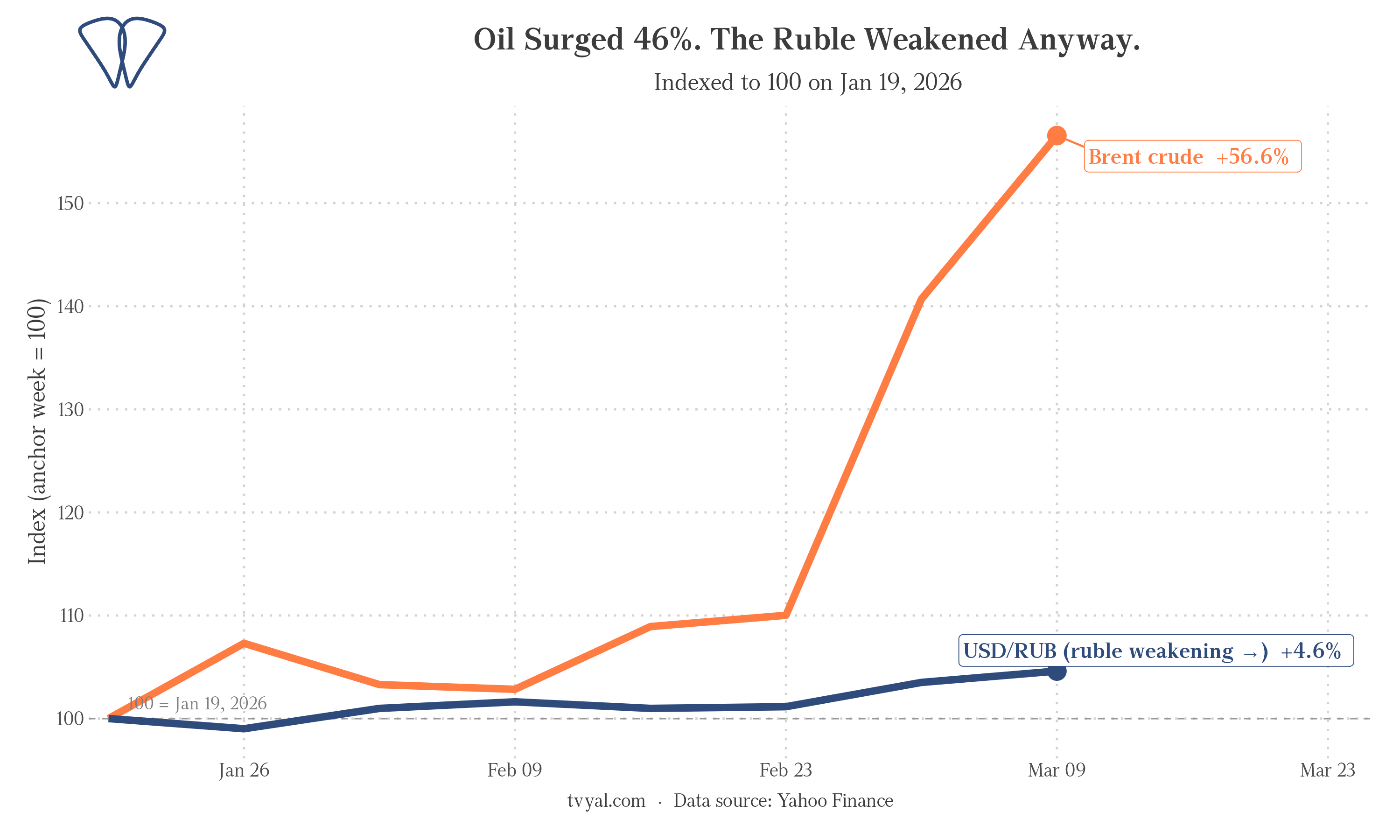 The market dynamics in March 2026 contradict this established logic. Over the past eight weeks, Brent crude oil rose from $70.7 to $103.4 per barrel. This is a 46.3% increase driven by the escalating conflict and the actual closure of the Strait of Hormuz to commercial shipping.[1] Under normal economic conditions, a change of this magnitude would have led to a sharp appreciation of the ruble. Instead, the USD/RUB exchange rate moved from 75.2 to 83.4, meaning the ruble weakened by 10.8% during the same period.