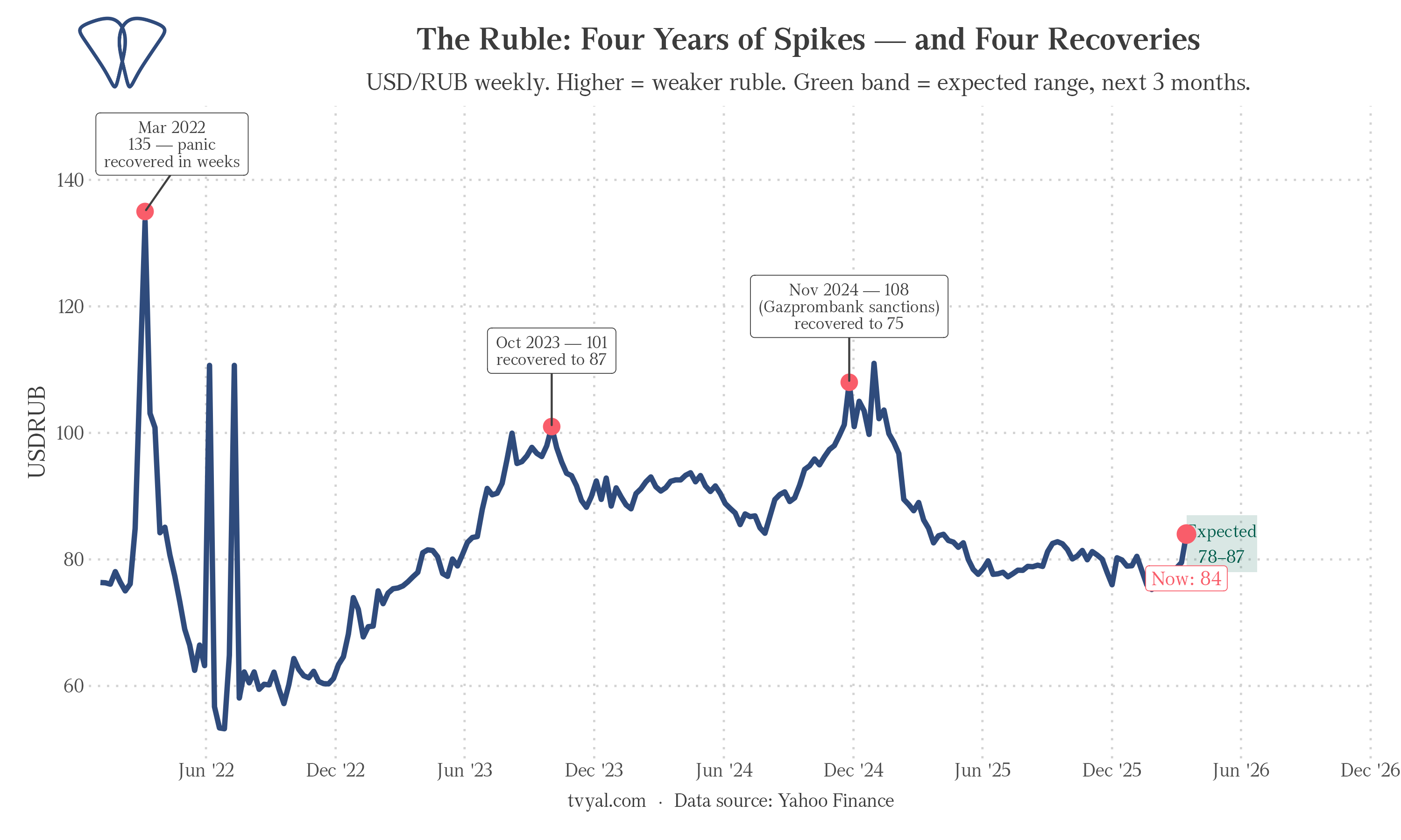 The scenario that would alter this base case requires two events to occur simultaneously. First, the Strait of Hormuz must fully reopen, causing oil prices to drop significantly below $65. Second, new financial sanctions must effectively close off the remaining alternative settlement channels.[4] Either development in isolation would be economically manageable. Both occurring together would push the ruble into a different structural regime, potentially driving the exchange rate toward the 90 to 95 range, where the central bank would face difficult decisions regarding interest rates.