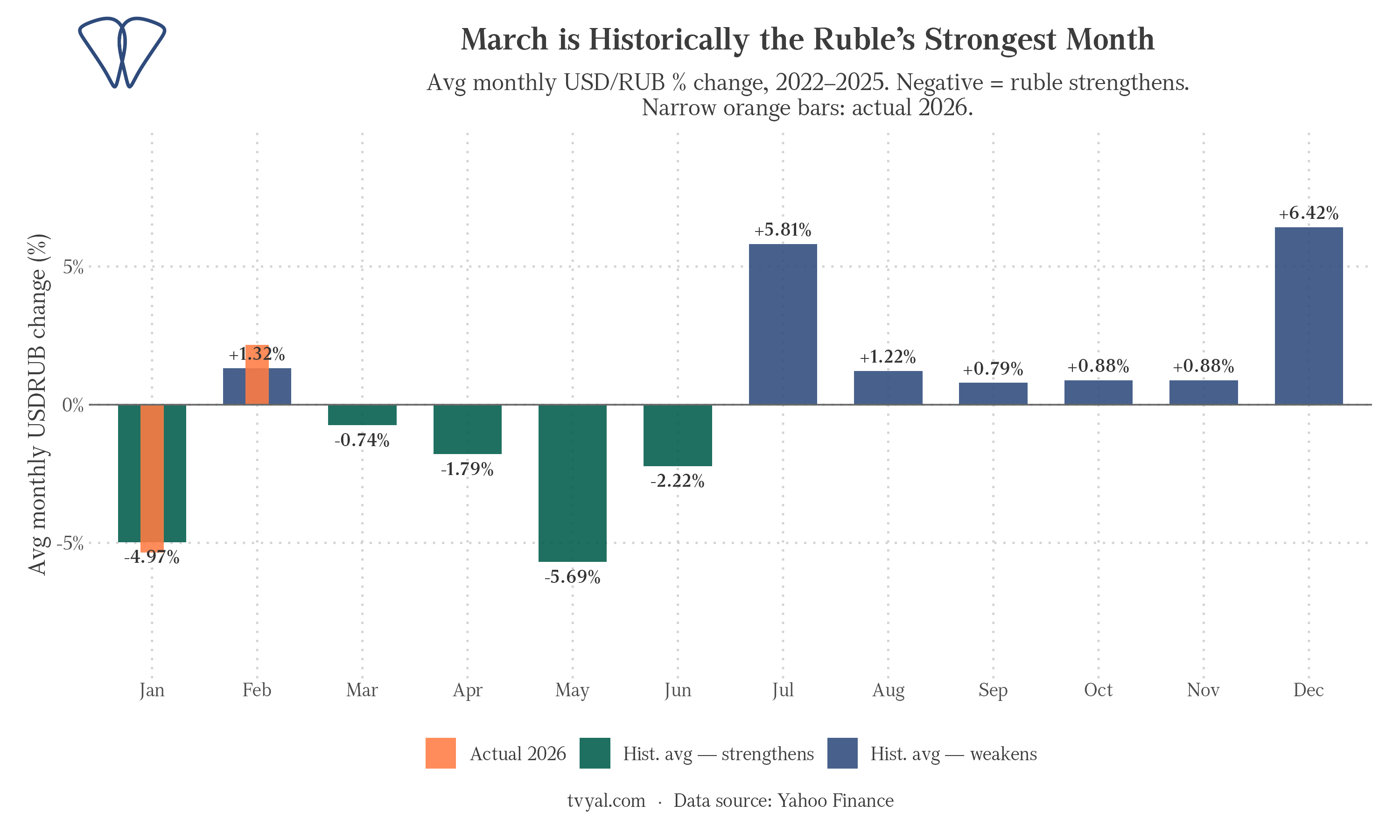 The historical data reveals a clear picture. March is statistically the strongest month for the ruble. On average, over those four years, the ruble appreciated by approximately 6.7% during March alone. The underlying mechanism is well documented. After a winter season characterized by heavy government spending and high import demand that pressures the currency, the spring tax period forces large Russian exporters to convert their foreign currency earnings to meet domestic ruble tax obligations. This mandatory conversion increases the supply of dollars and yuan in the market, leading to a stronger ruble.