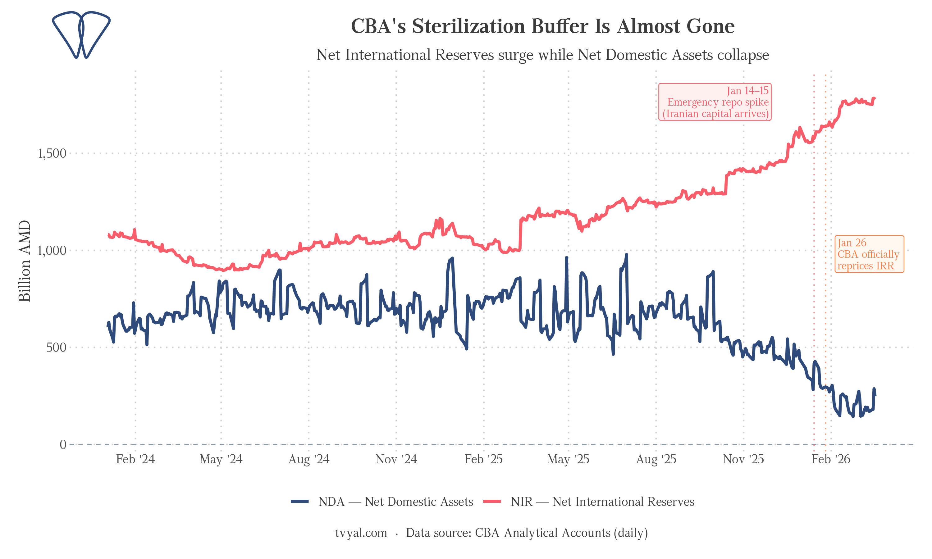 NDA stood at 649 billion drams in January 2025. Today it is 198 billion, a 70% collapse in 15 months. At the current pace of capital absorption, the remaining sterilization buffer could be exhausted within two quarters. When NDA reaches zero, any new dollar arriving in the country directly expands the money supply. Armenia’s monetary policy buffer is being ground down.