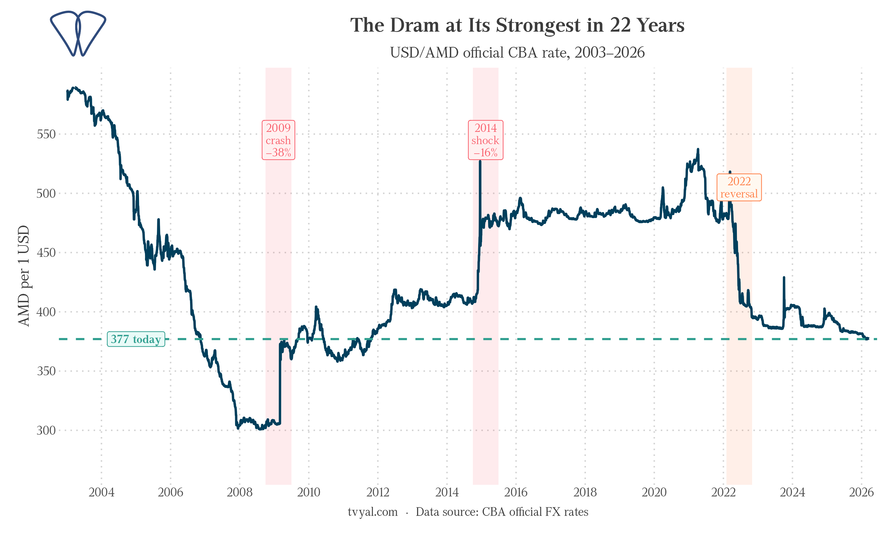 The chart above shows USD/AMD since 2003. That history has three distinct arcs. From 2003 to 2008, the dram strengthened steadily from around 560 per dollar to just 304 (the strongest level in modern history), driven by a construction boom and rising remittances. The 2009 global financial crisis ended that: the rate corrected sharply and then settled in the 400–415 range through 2013. The second break came in late 2014 when the Russian ruble crisis transmitted instantly through Armenia’s remittance channel: the dram fell to 480, briefly spiked to 580 in panic, and held near 480 for nearly six years. The paradox arrived in 2022: when the Ukraine war began, markets expected another ruble-style shock. Instead the opposite happened: capital and workers flooded in from Russia and the dram strengthened, becoming the most appreciated convertible currency in the world that year.
